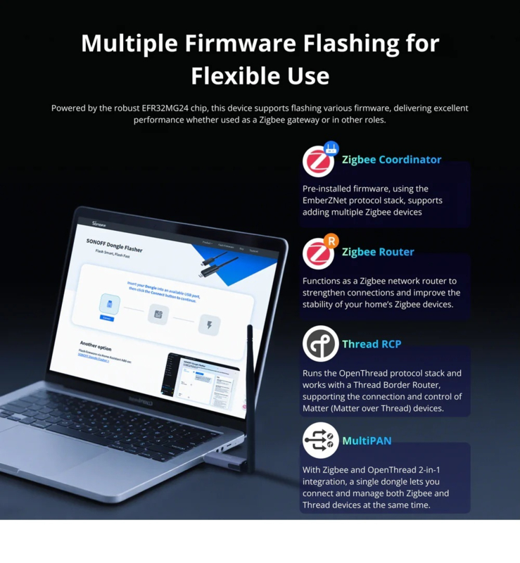 L’appareil est livré avec un firmware de coordinateur Zigbee, mais peut facilement être flashé pour d’autres rôles à l’aide de l’outil web SONOFF Dongle Flasher – comme routeur Zigbee, OpenThread RCP ou même un appareil MultiPAN – le tout en moins d’une minute. Le paquet inclut un câble d’extension USB d’un mètre, permettant un placement flexible et réduisant les interférences.